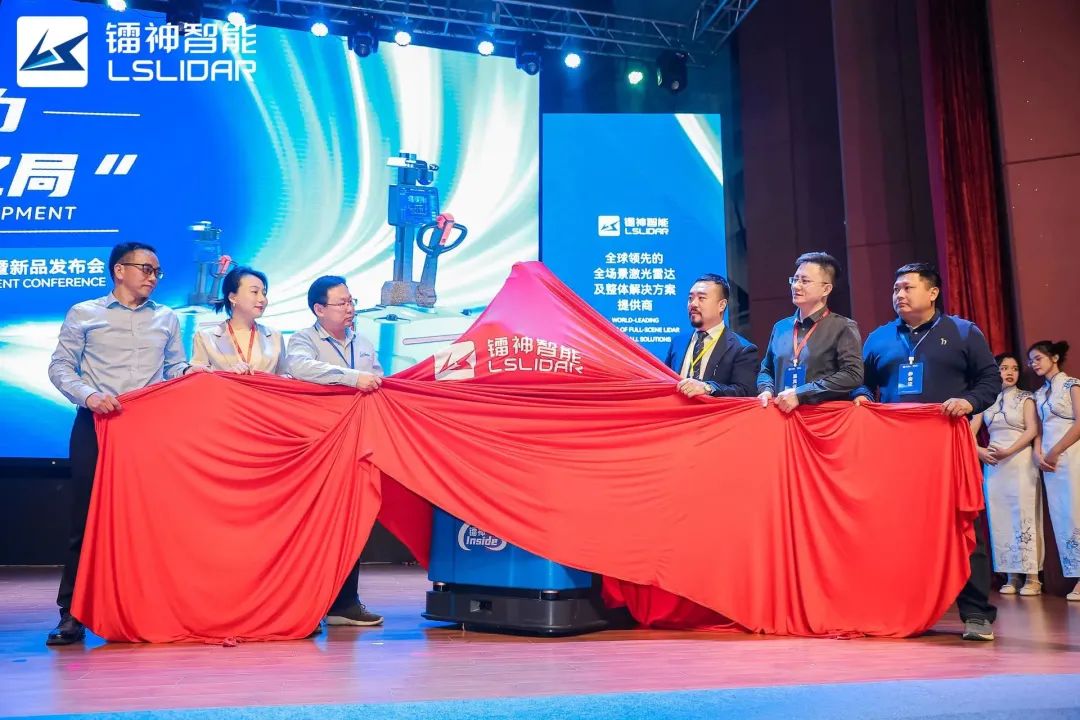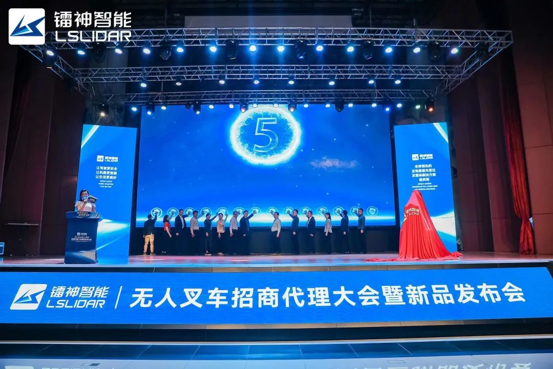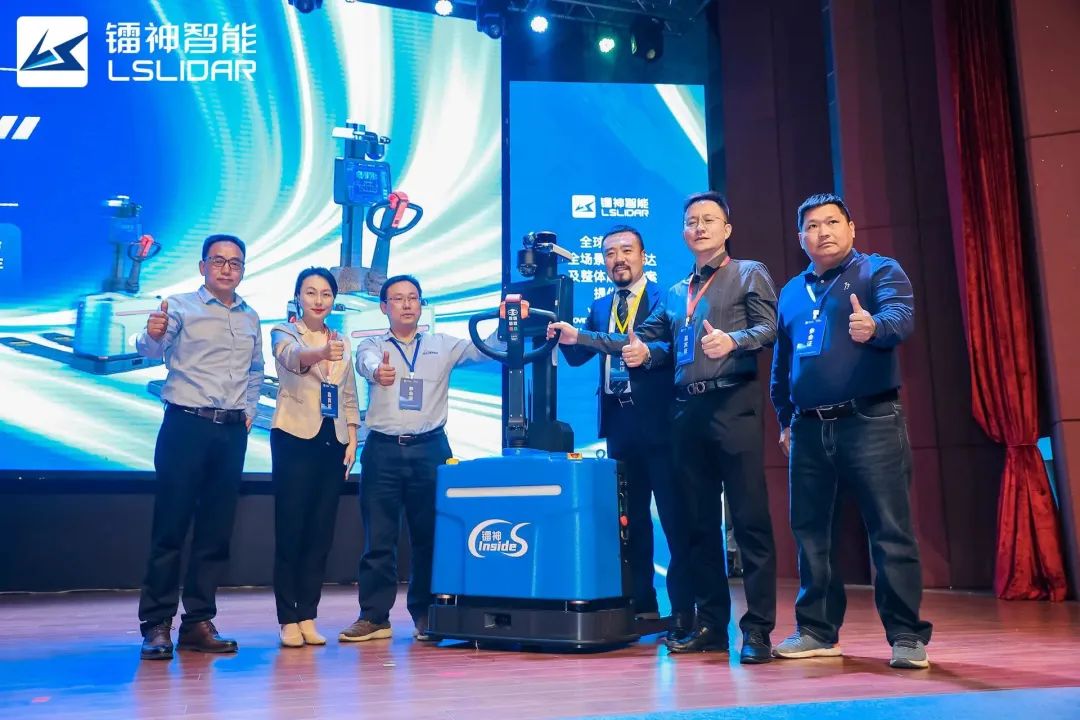 各位領導與嘉賓進行盛大啟動儀式后,鐳神智能董事長&CEO胡小波與幾位業內資深專家共同為本次的明星產品——鐳神智能輕量搬運式激光雷達3D SLAM無人叉車揭開面紗,正式面市亮相。
