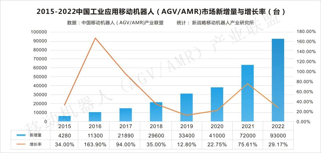 圖表:2015-2022中國工業應用移動機器人(AGV/AMR)新增量與增長率