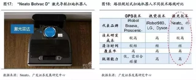 其中,由于掃地機器人面向消費市場,相同品牌下的激光導航掃地機器人和無任何導航方式的隨機碰撞式掃地機器人相比,價格一般貴出80%-150%,其普及過程與成本降低的進程高度相關。但路徑規劃式掃地機器人無論是從清潔效率或清潔質量上都比隨機碰撞式掃地機器人高出很多,是未來掃地機器人發展的方向。激光導航技術與同屬于路徑規劃類技術的GPS技術和視覺技術相比,激光導航技術在綜合能力上還是略占上風。