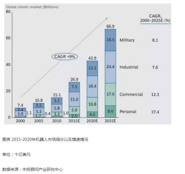 商業機器人市場于2015年達到了59億美金,主要受益于在商業機器人中占比極大的醫療及手術機器人的迅速增長,未來市場份額有望在2025年達到170億美金,取代軍用機器人板塊成為第二大機器人市場。
