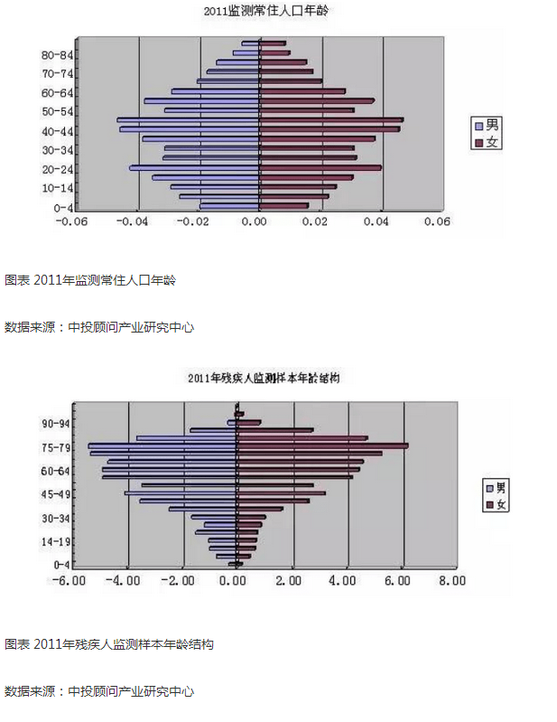人口老齡化增加了致殘幾率和殘疾人的數量,殘疾人年齡結構呈倒金字塔型,年齡越大,比重越高。老年人由于生理機能衰退,腦血管疾病、骨關節病、癡呆等發病率和致殘幾率增高。