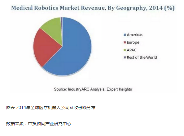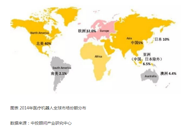 未來隨著對高難度手術需求的增多、醫療基礎設施的不斷升級以及醫療保健費用不斷提高,越來越多國外醫院科室及診所開始逐漸增加對可輔助手術的醫療機器人的支持程度。但從全球醫療機器人的市場份額分布來看,2014年,北美醫療機器人市場占全球總市場的40%,其次為歐洲,占比32%。相比新興國家5%甚至更低的市場占比而言,歐美國家的醫療機器人市場競爭更為激烈。