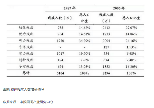 我國肢體殘疾基數龐大,且人數仍在遞增。相較于1987年第一次全國殘疾人抽樣調查數據,2006年第二次抽樣調查數據表示,殘疾類別結構發生改變,肢體殘疾人數大幅增加,肢體殘疾人數從1987年的755萬上升到2006年的2412萬,占殘疾總人口比重為29.07%,是殘疾的最主要類型。另外,由于我國殘疾標準較為嚴格,與發達國家相比,殘疾人比例相對較低,國際社會公認的全球殘疾人比例約為全球總人口的10%,2006年我國的殘疾人口比例約為6.34%,因此我國目前的殘疾人數可能存在一定的低估。根據第六次全國人口普查的總人數,以及第二次全國殘疾人抽樣調查殘疾人占比,推算2010年末我國殘疾人總人數8502萬人中,肢體殘疾2472萬人。