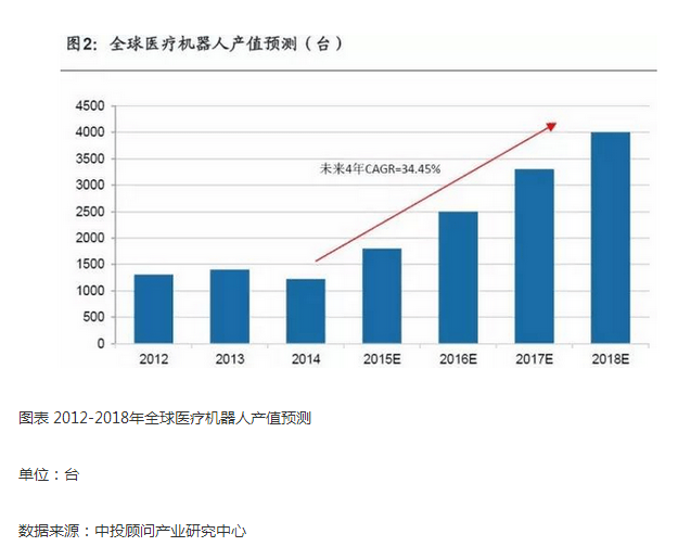 在2018年,全球醫療機器人的銷量會達到約4000臺,從2014年起,未來4年內平均每年年均復合增速達到34.45%,在中國這一數字會更加好看。
