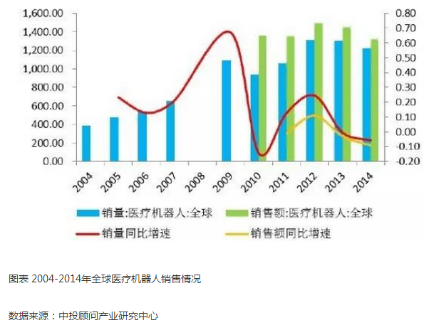 2014年全球醫療機器人的銷量為1224臺,與2004年全球醫療機器人銷量為386臺相比,年復合增速達12.2%。