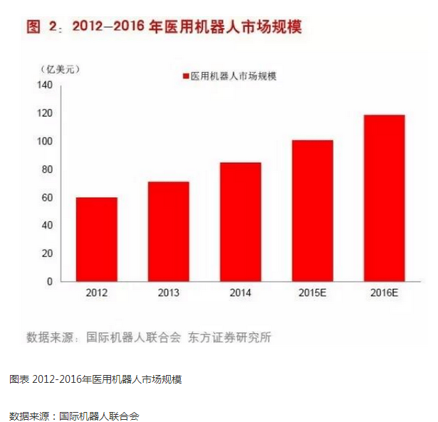 手術機器人市場規模在2014年為32億美元,伴隨著下一代設備、系統和器械的發布,手術機器人將從目前的大型開放手術,覆蓋到身體中的微小部分。預計2021年將達到200億美元。