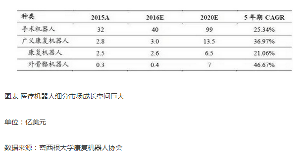 康復機器人是輔助人體完成肢體動作,實現助殘行走、康復治療、負重行走、減輕勞動強度等功能的一種醫用機器人。我們認為康復機器人的下游市場可被認為是一種特殊環境下的“可穿戴設備”,在應用技術突破后的市場需求量巨大,未來幾年產業增長速度將超過整體醫用機器人市場的增長速度。預測康復機器人市場將從2015年的4300萬美元增長至2020年的18億美元。
