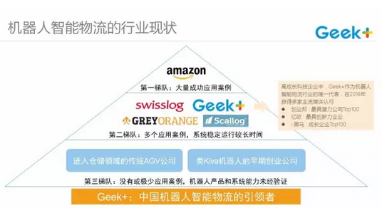 那么作為機(jī)器人智能物流的第一梯隊(duì),當(dāng)屬亞馬遜機(jī)器人,亞馬遜機(jī)器人是這個(gè)領(lǐng)域上真正的擁有大量的成功應(yīng)用案例的一家公司。而在第二梯隊(duì)的眾多玩家們,他們都有著多個(gè)應(yīng)用的案例,并且已經(jīng)存在了穩(wěn)定的良好運(yùn)行業(yè)績(jī),這樣的公司就包括,國(guó)際上的Swisslog,Grey Orange等,在國(guó)內(nèi)有Geek+這樣的企業(yè)。而作為這個(gè)細(xì)分領(lǐng)域的第三梯隊(duì),則更多是一些傳統(tǒng)的AGV公司或者是類Kiva機(jī)器人這樣的早期創(chuàng)業(yè)公司,那么這一梯隊(duì)的公司目前還還不具備特別,多的應(yīng)用案例,并且機(jī)器人產(chǎn)品和系統(tǒng)的能力并沒有得到充分的驗(yàn)證。