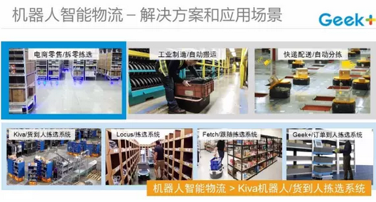 機(jī)器人智能物流,即是用機(jī)器人作為物理載體,綜合機(jī)器人、人工智能、大數(shù)據(jù)等先進(jìn)技術(shù),將物流的不同環(huán)節(jié)實(shí)現(xiàn)自動(dòng)化、柔性化、智能化的系統(tǒng)級(jí)解決方案。機(jī)器人智能物流領(lǐng)域的成熟產(chǎn)品包括智能叉車、揀選機(jī)器人、分揀機(jī)器人、搬運(yùn)機(jī)器人、無(wú)人機(jī)、配送機(jī)器人小車等。目前在該領(lǐng)域,技術(shù)實(shí)現(xiàn)程度最高及應(yīng)用最廣的是機(jī)器人揀選系統(tǒng),其中的知名公司包括亞馬遜機(jī)器人、Locus、Geek+、Fetch等國(guó)內(nèi)外的一系列優(yōu)秀企業(yè)。
