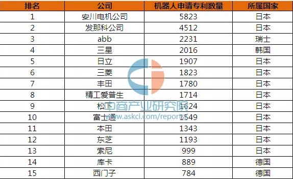 另外,據(jù)數(shù)據(jù)統(tǒng)計(jì)在工業(yè)機(jī)器人產(chǎn)業(yè)全球重要專利申請人中,日本的安川電機(jī)公司和發(fā)那科公司分別以5823項(xiàng)4512項(xiàng)專利申請位居全球前兩位,abb(2231項(xiàng))三星(2016項(xiàng))日立(1907項(xiàng))三菱(1823項(xiàng))豐田(1780項(xiàng))精工愛普生(1714項(xiàng))松下(1624項(xiàng))富士通(1549項(xiàng))本田(1343項(xiàng))東芝(1193項(xiàng))索尼(999項(xiàng))庫卡(889項(xiàng))和西門子(784項(xiàng))等公司緊隨其后。