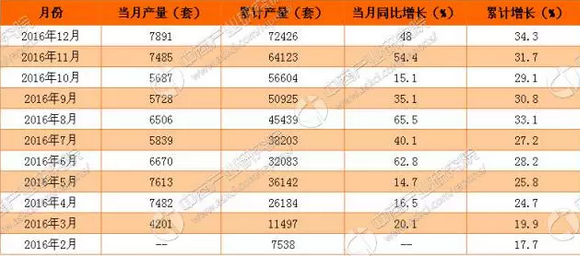 2016年全年產(chǎn)量達(dá)72426套 累計(jì)增長34.3%在中央及地方政府的大力推動(dòng)下,2016年中國工業(yè)機(jī)器人行業(yè)得到發(fā)展,產(chǎn)量全年保持增長。除了多重利好政策的推動(dòng),制造企業(yè)轉(zhuǎn)型升級,將工業(yè)機(jī)器人用來替代人力以提高自身競爭力,工業(yè)機(jī)器人需求大。2016年全年工業(yè)機(jī)器人產(chǎn)量達(dá)到72426套,增長34.3%。