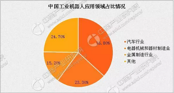 汽車行業(yè)仍是主要應(yīng)用領(lǐng)域工業(yè)機(jī)器人在國內(nèi)的應(yīng)用以汽車以及電子工業(yè)居多,此外還有橡膠塑料、軍工、航空制造、食品工業(yè)、醫(yī)藥設(shè)備、金屬制品等領(lǐng)域。從應(yīng)用行業(yè)看,汽車行業(yè)依舊是中國工業(yè)機(jī)器人市場最大的消費(fèi)行業(yè),電氣機(jī)械和器材制造業(yè)位居第二位,金屬制造行業(yè)位居第三位。