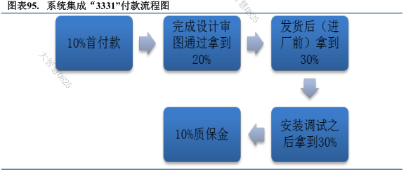系統(tǒng)集成的付款通常采用“3331”的方式,即圖紙通過(guò)審核后拿到 30%,發(fā)貨后拿到 30%,安裝調(diào)試完畢拿到 30%,最后剩 10%的質(zhì)保金。按照這樣一個(gè)付款流程,系統(tǒng)集成商通常需要墊資。