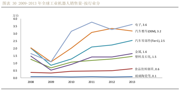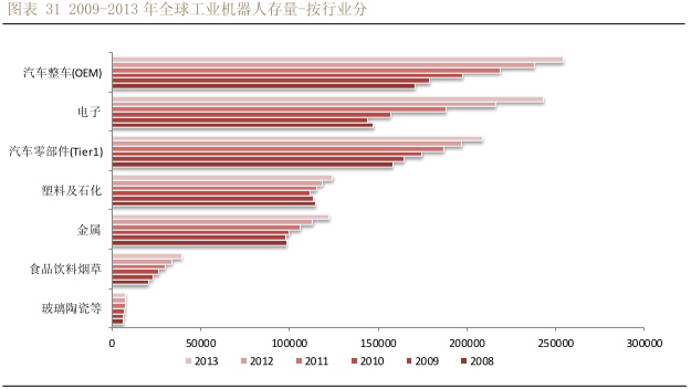 對(duì)比汽車行業(yè)與非汽車行業(yè)的機(jī)器人銷售增長(zhǎng)率,非汽車行業(yè)的增長(zhǎng)率 2013 年超過(guò) 80%。機(jī)器人下游最終用戶可以按照行業(yè)分為:汽車工業(yè),一般工業(yè)。一般工業(yè)中又可以分為食品飲料,石化,金屬加工,醫(yī)藥,3C,塑料,白家電等等。