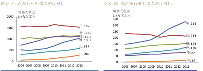 對(duì)比機(jī)器人密度,中國(guó)汽車行業(yè)機(jī)器人密度為 281,而非汽車行業(yè)僅為 14。與其他國(guó)家相比,中國(guó)汽車行業(yè)的機(jī)器人密度為臺(tái)灣的 1/2,德國(guó)的 1/4。但中國(guó)非汽車行業(yè)的機(jī)器人密度為臺(tái)灣的 1/9,德國(guó)的 1/11。故非汽車行業(yè)的潛能巨大。