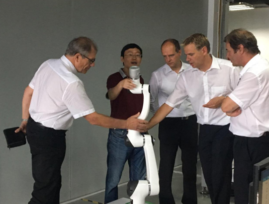 德國教授們對大族研發的人機協作性機器人Elfin表現出了濃厚的興趣,親身體驗這款協作機器人的安全停機和零力示教功能。王總向教授們詳細介紹了Elfin機器人的性能特點,并現場演示了機器人的特殊功能。教授們稱贊這款協作機器人是世界上最好的機器人之一。