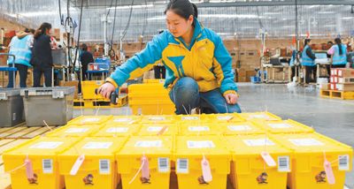 記者在蘇寧南京物流基地看到,常見的包裝紙箱被堆到一邊,工人們忙著搬運 一種黃色的共享快遞盒,它有中等紙箱大小,易于收納和碼放,更不必擔心壓壞箱內(nèi)物品。