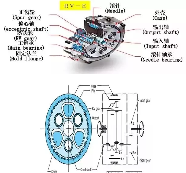 RV-E是兩級減速齒輪,第一級減速是輸入齒輪和正齒輪的外嚙合,三個正齒輪(spur gear)以120°的間隔對稱于輸出軸。