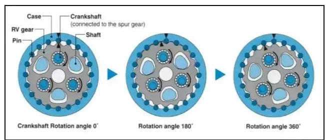 在外殼的內環圈內裝有圓柱形的滾針,RV齒輪的偏心運動引起滾針與擺線形RV輪齒的嚙合和脫離,產生多組RV輪齒與滾針同時嚙合,提高負載能力。 由于RV齒數比滾針少1個數目,因此當偏心軸旋轉一周時,如果固定外殼 (case),則RV齒輪與輸入軸同向轉1個齒的角度。