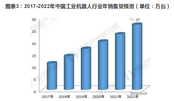 據IFR預測,隨著產業轉型升級的需求,人力成本的上升,以及國家政策的扶持,2017-2022年我國工業機器人未來的增速可達30%以上,到2022年我國工業機器人年銷售量超過27萬臺。
