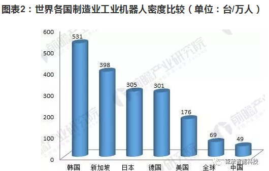 經過上述四個階段的發展,我國工業機器人得到一定程度的普及。根據前瞻產業研究院發布的《工業機器人行業產銷需求預測與轉型升級分析報告》數據顯示,2016年,中國工業機器人的保有量達到30萬臺。此外,與先進的制造業國家相比,我國工業機器人使用密度還有不少差距,工業機器人的保有量仍有巨大上升空間。
