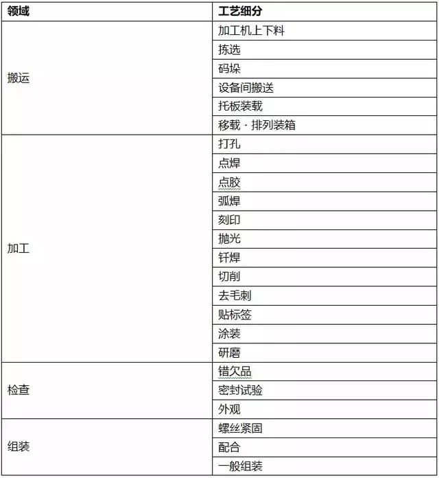 工業機器人應用常見于四大領域,分別是搬運、加工、檢查及組裝。各領域又分為多個工藝,具體工藝細分見下表: