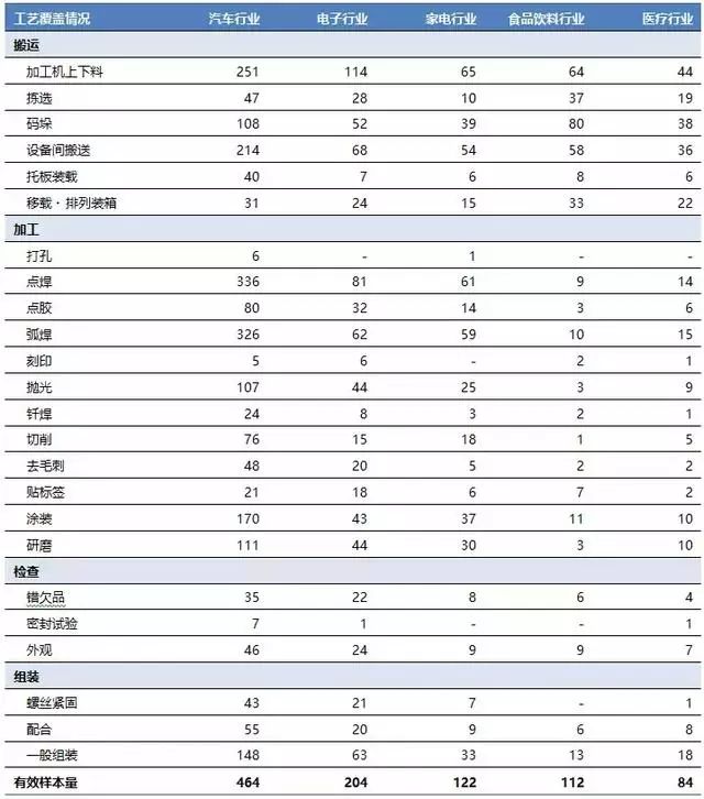 MIR對610家系統集成商中的541家進行了工藝覆蓋分析。分析表明,不同行業系統集成商工藝的覆蓋程度不同,例如在汽車整車及零部件生產中,有大量加工機上下料、設備間搬送、點焊、弧焊、拋光、涂裝、組裝等工序,目前大多都是由工業機器人完成,因此汽車行業機器人系統集成商業務基本都會覆蓋這些工藝段;而電子機器人系統集成商,主要集中在加工機上下料、設備間搬送、點焊、弧焊、組裝等工序。