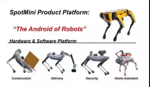 波士頓動(dòng)力在提出商業(yè)化計(jì)劃的同時(shí),也提出了一個(gè)更大膽的想法,其CEO Raibert 希望打造一個(gè)類(lèi)似iOS和安卓操作系統(tǒng)的通用平臺(tái)。用戶會(huì)得到一個(gè)基本款的SpotMini,再與波士頓動(dòng)力或第三方一起構(gòu)建硬件和軟件,例如手臂及其他組件等,從而無(wú)限拓展SpotMini的功能和應(yīng)用。例如SpotMini機(jī)器臂使用的擴(kuò)展端口支持第三方設(shè)計(jì)和生產(chǎn)的附加工具,用戶可安裝攝像頭、傳感器等等,這樣按照客戶需求生產(chǎn)的SpotMini可以應(yīng)用在不同領(lǐng)域,面向廣大市場(chǎng)更加具有實(shí)用性。