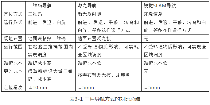 視覺SLAM導航不依賴于二維碼和反光柱,是未來導航技術的主流方向。此導航方式只需要收集場景中的信息便可以進行實時定位。視覺SLAM導航與二維碼導航相比,視覺SLAM導航擁有更加豐富的運動方式,且沒有場地布置和場地維護的費用,使用成本遠遠低于二維碼導航。表3-1是對二維碼導航、激光導航、視覺SLAM導航的對比總結。