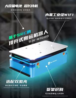 首先看一下基于仙知SRC的頂升式搬運(yùn)機(jī)器人SJV-W600系列。 該系列產(chǎn)品內(nèi)置工業(yè)級(jí) WiFi 客戶端設(shè)備,更穩(wěn)健的網(wǎng)絡(luò)數(shù)據(jù)交互,支持 WiFi 漫游,最高限額600KG的貨物搬運(yùn)。