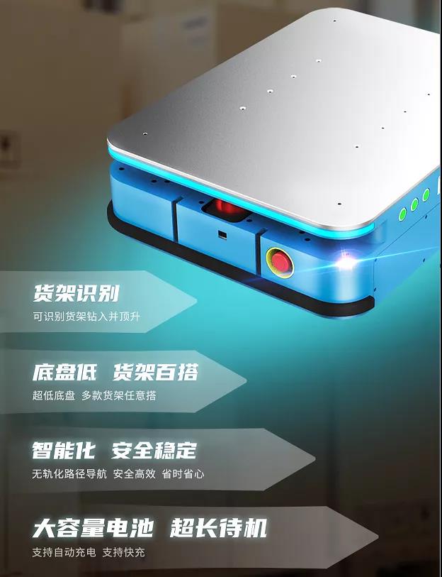 具體優(yōu)勢(shì):超低底盤,多款貨架任意搭配;速度快,效率提升;超快速度,最快 2s 即可到達(dá)頂升限位;智能化,安全穩(wěn)定;無軌化路徑導(dǎo)航,安全高效,省時(shí)省心;大容量電池,超長(zhǎng)待機(jī);支持自動(dòng)充電,支持快充;