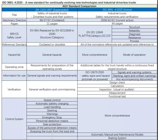 據了解,此次ISO 3691-4新標準的發布,距離上一版標準EN 1525:1997,時隔了23年,或被譽為是“史上最全面”的無人工業車輛標準。近年隨著各種新興技術的快速發展,EN 1525已經不能滿足更多復雜應用場景對于無人工業車輛的安全要求。新標準ISO 3691-4從更全面的角度,在傳承了EN 1525技術框架的基礎上,進一步完善了安全架構,拓展了安全功能要求,以及明確更具實操性的各種驗證方法。從前端應用場景的風險評估及分析、安全系統硬件架構,軟件安全設計、安全功能測試和現場實施等多個方面,新標準為新一代無人工業車輛提供了權威的設計準則。